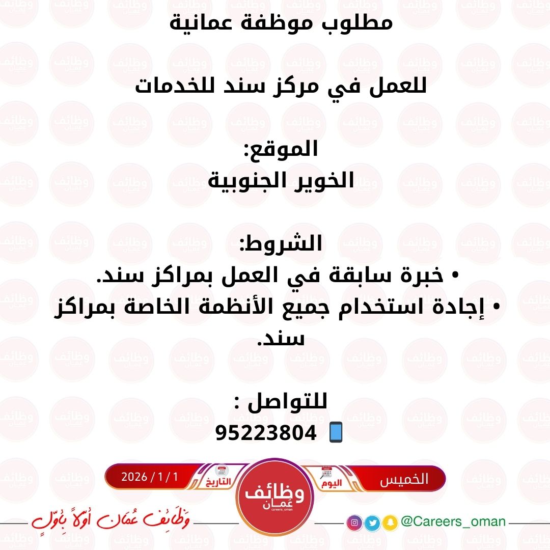 الموضوع: مركز سند للخدمات في الخوير الجنوبية - وظيفة شاغرة ( موظفة )