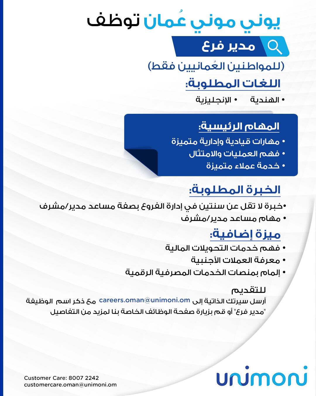 ارسل السيرة الذاتية على الايميل careers.oman@unimoni.om
