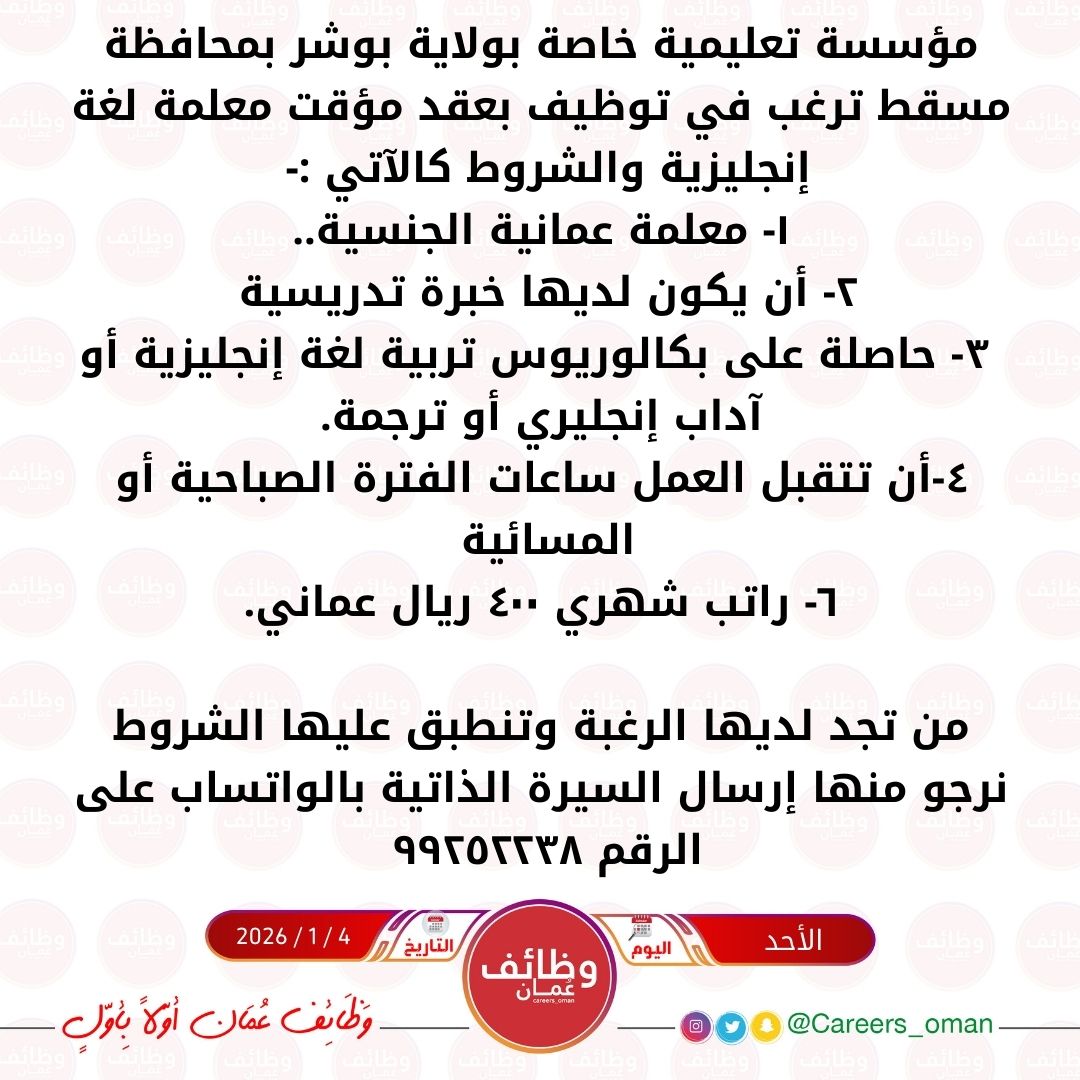 الموضوع: مؤسسة تعليمية خاصة بولاية بوشر - وظيفة شاغرة بعقد مؤقت ( معلمة لغة إنجليزية )