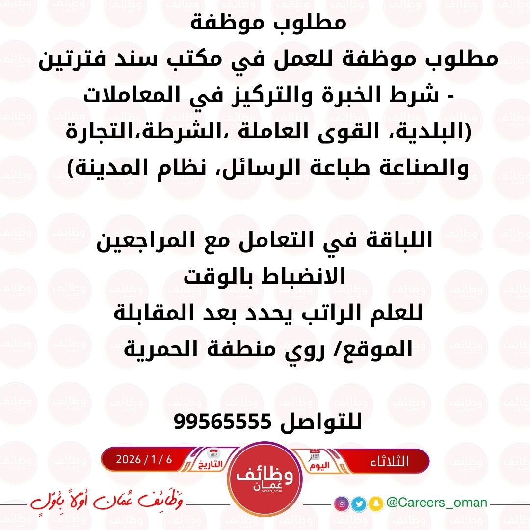 الموضوع: مكتب سند في روي - وظيفة شاغرة ( موظفة )