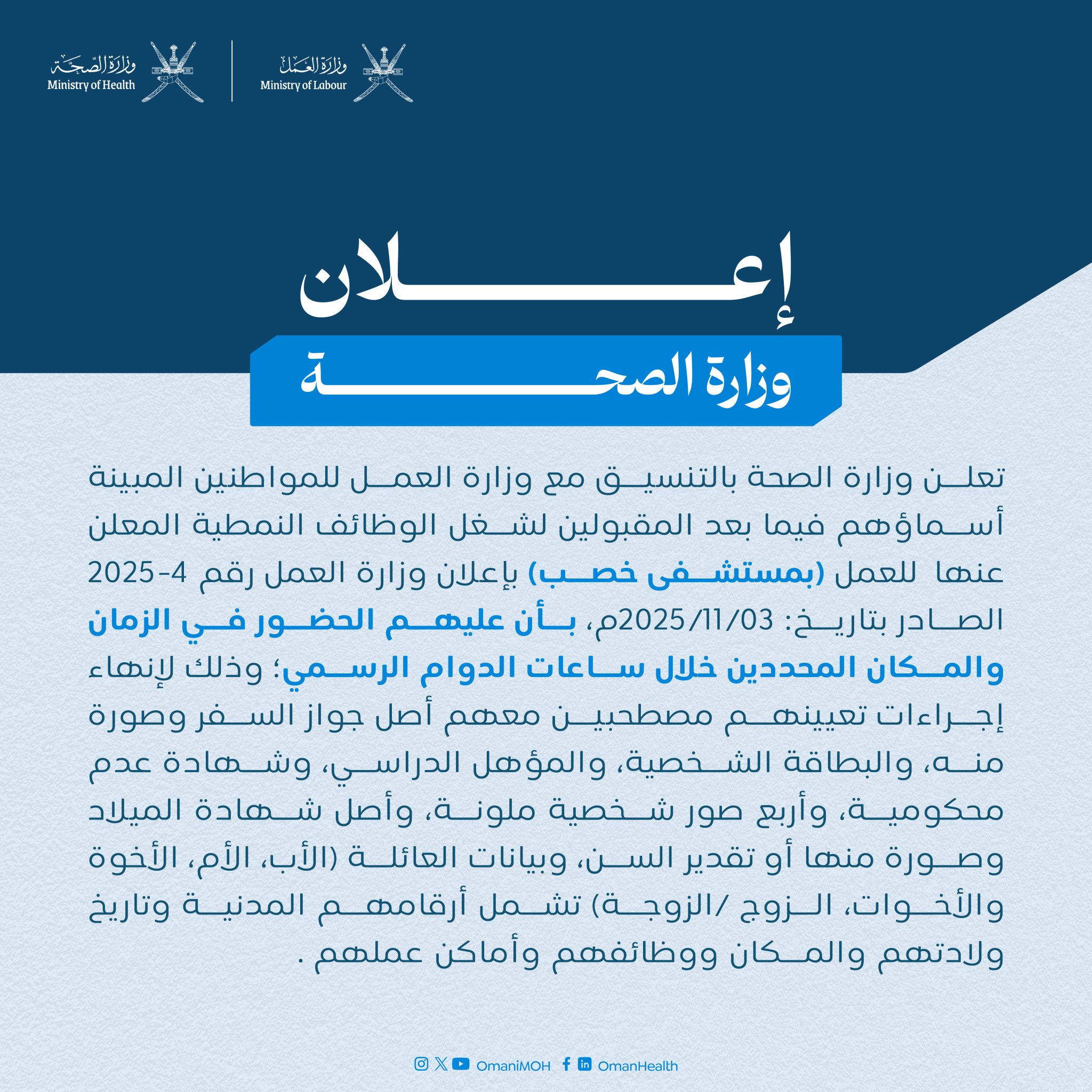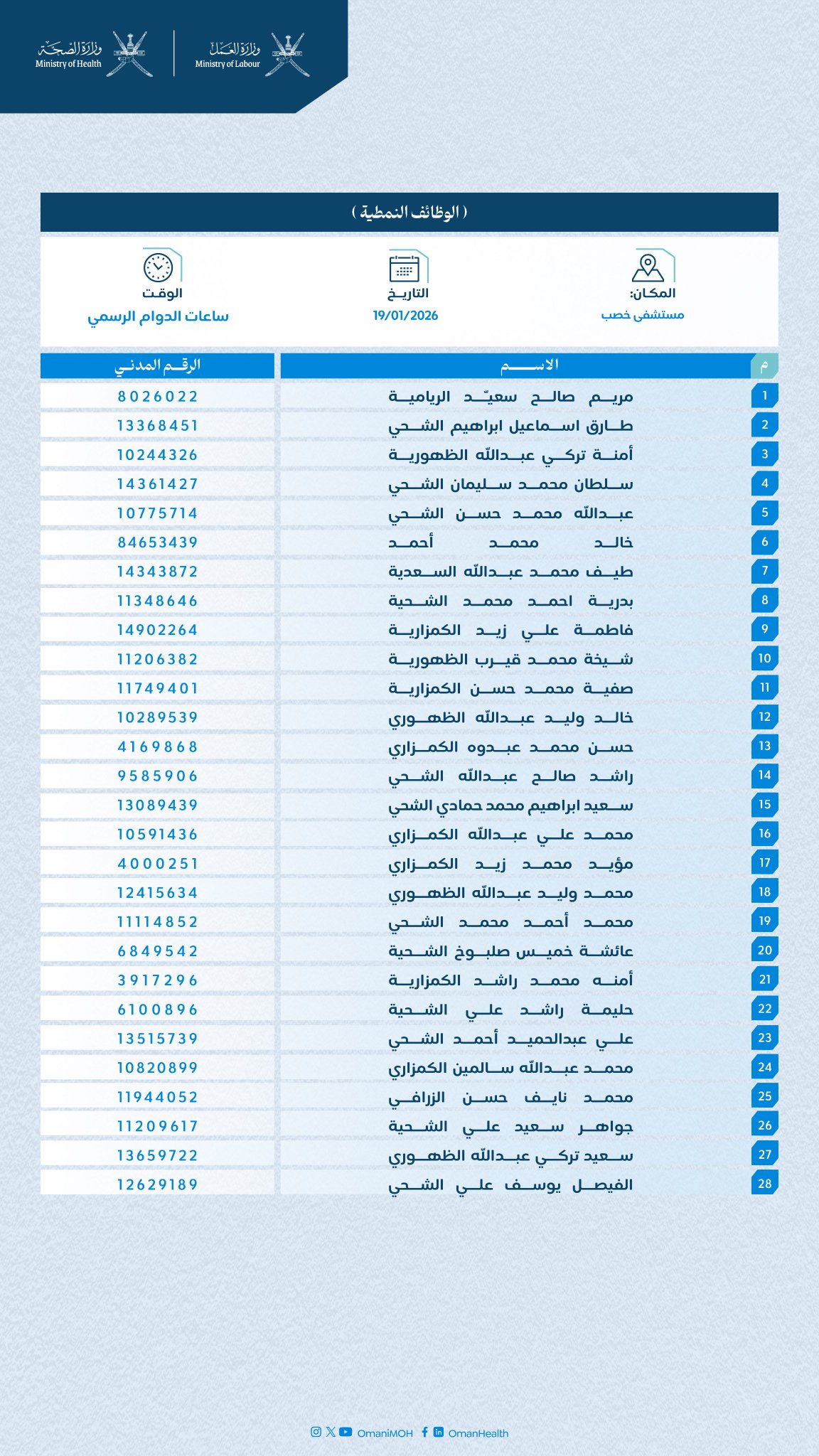 الموضوع: وزارة الصحة – أسماء المترشحين لاستكمال إجراءات التعيين لشغل وظائف للعمل ( بمستشفى خصب )
