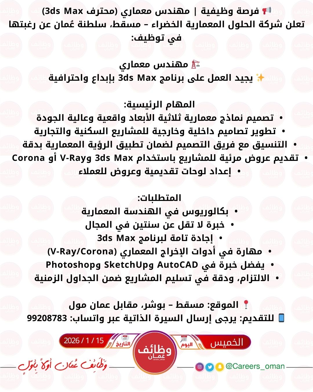 الموضوع: شركة الحلول المعمارية الخضراء في بوشر - وظيفة شاغرة ( مهندس معماري / محترف 3ds Max )