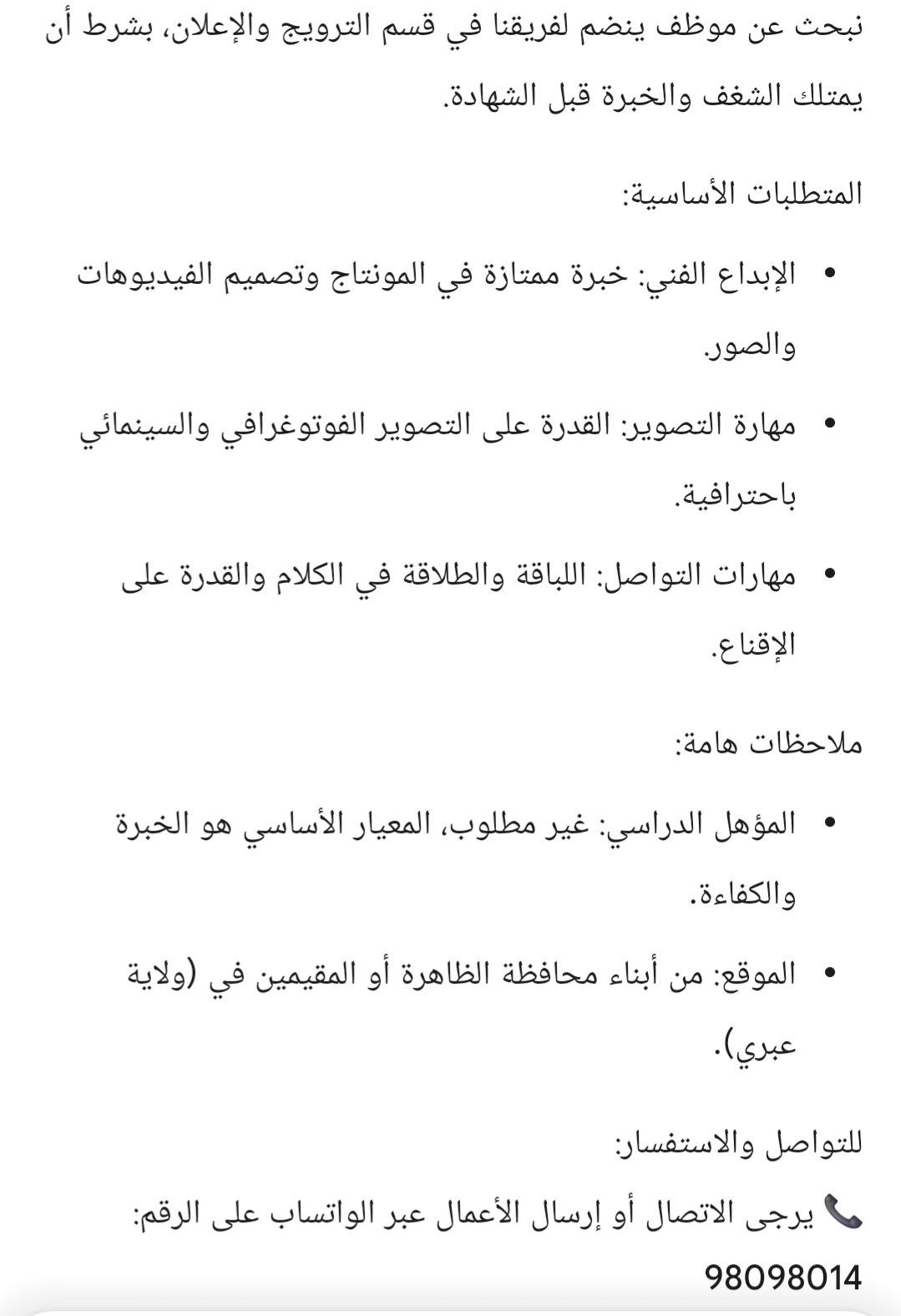 الموضوع: شركة رائدة في ولاية عبري - وظيفة شاغرة في قسم الترويج والإعلان