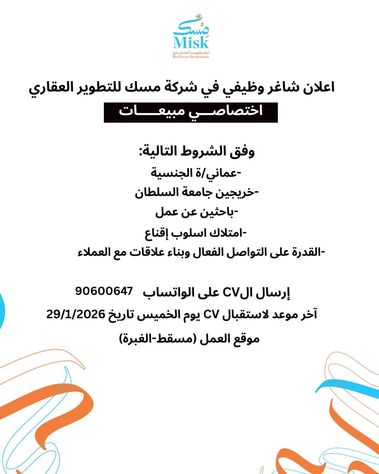 الموضوع: شركة مسك للتطوير العقاري في الغبرة - وظيفة شاغرة ( اختصاصي مبيعات )