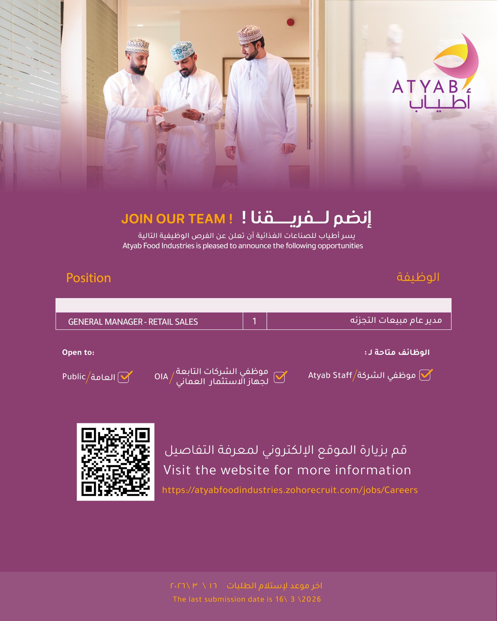 رابط التسجيل https://atyabfoodindustries.zohorecr...m/jobs/Careers