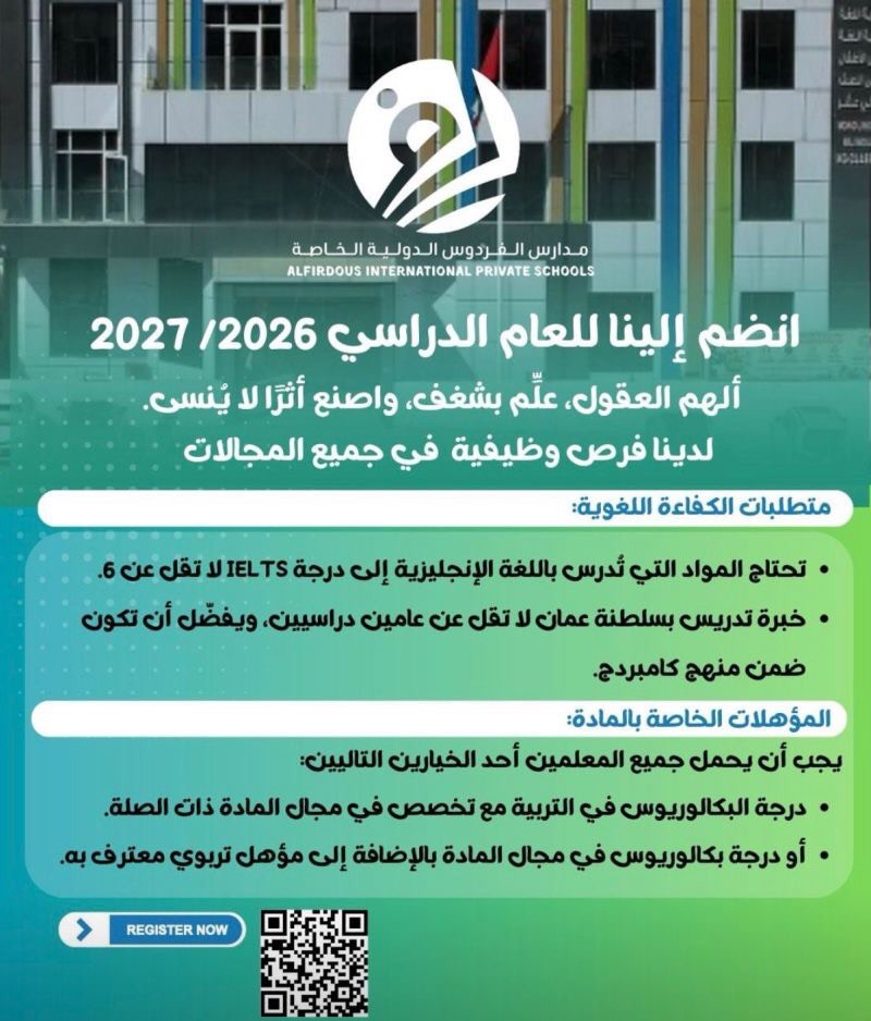 الموضوع: مدارس الفردوس الدولية الخاصة - فرص وظيفية في جميع المجالات