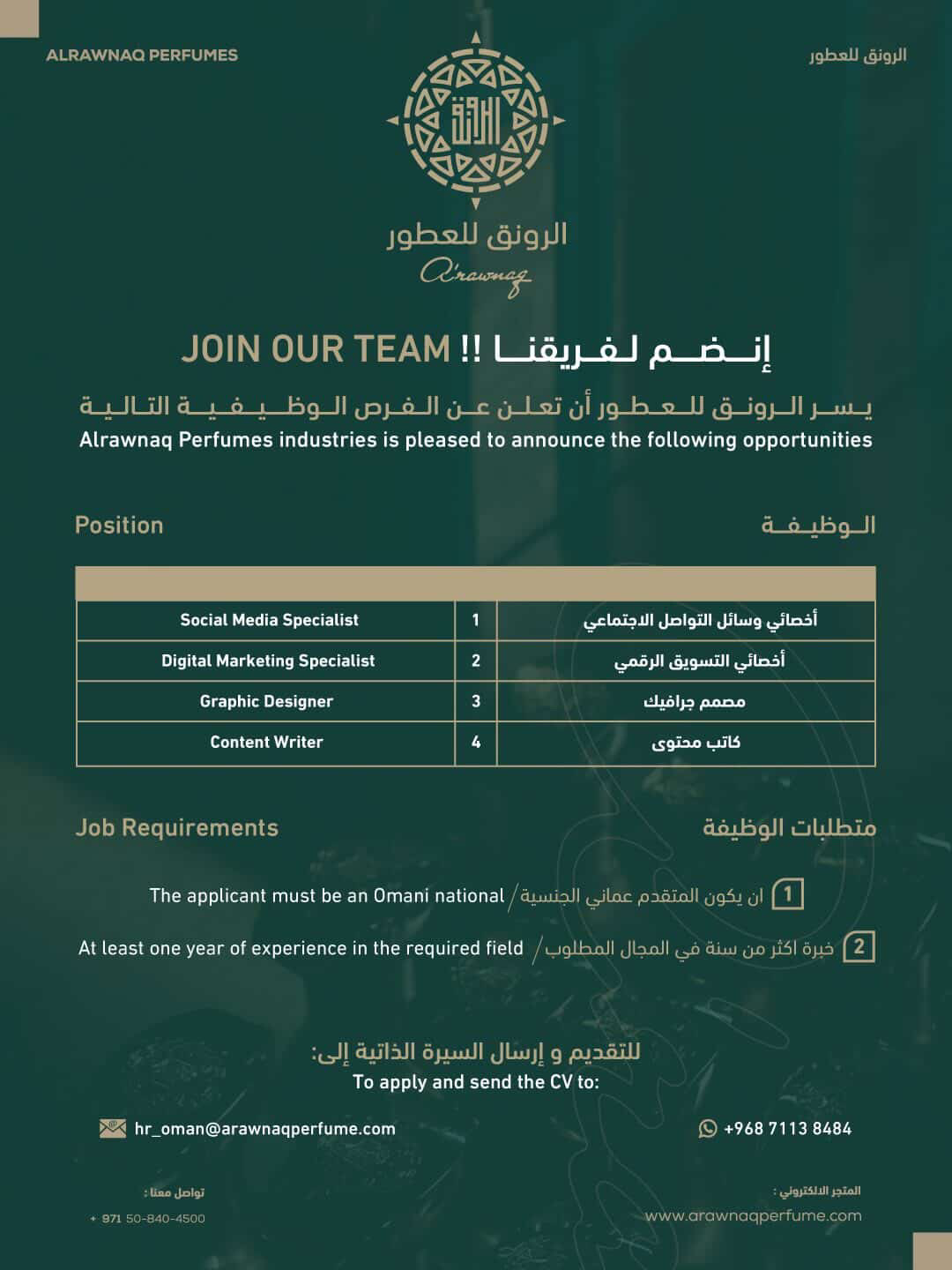 ارسل السيرة الذاتية على الايميل hr_oman@arawnaqperfume.com