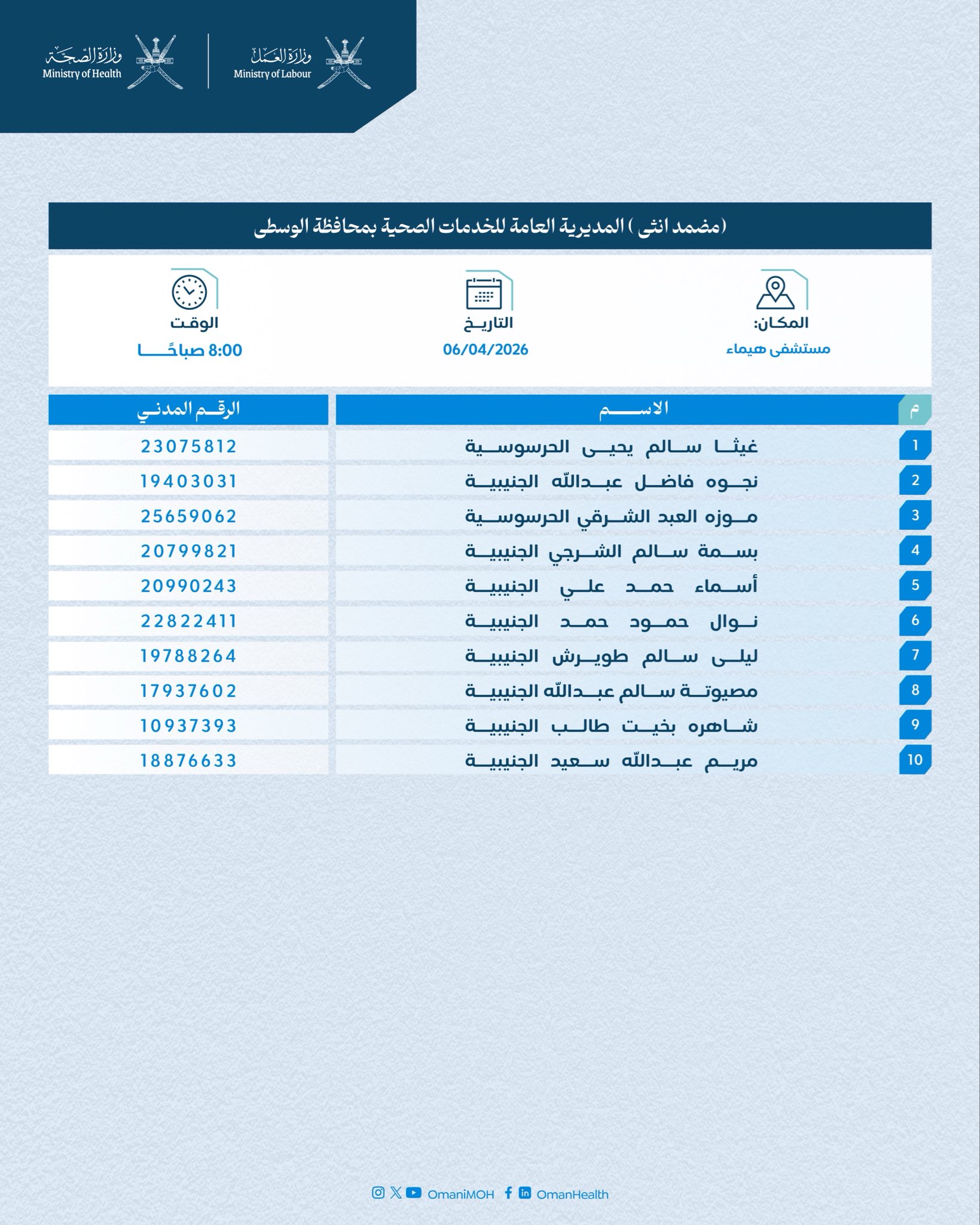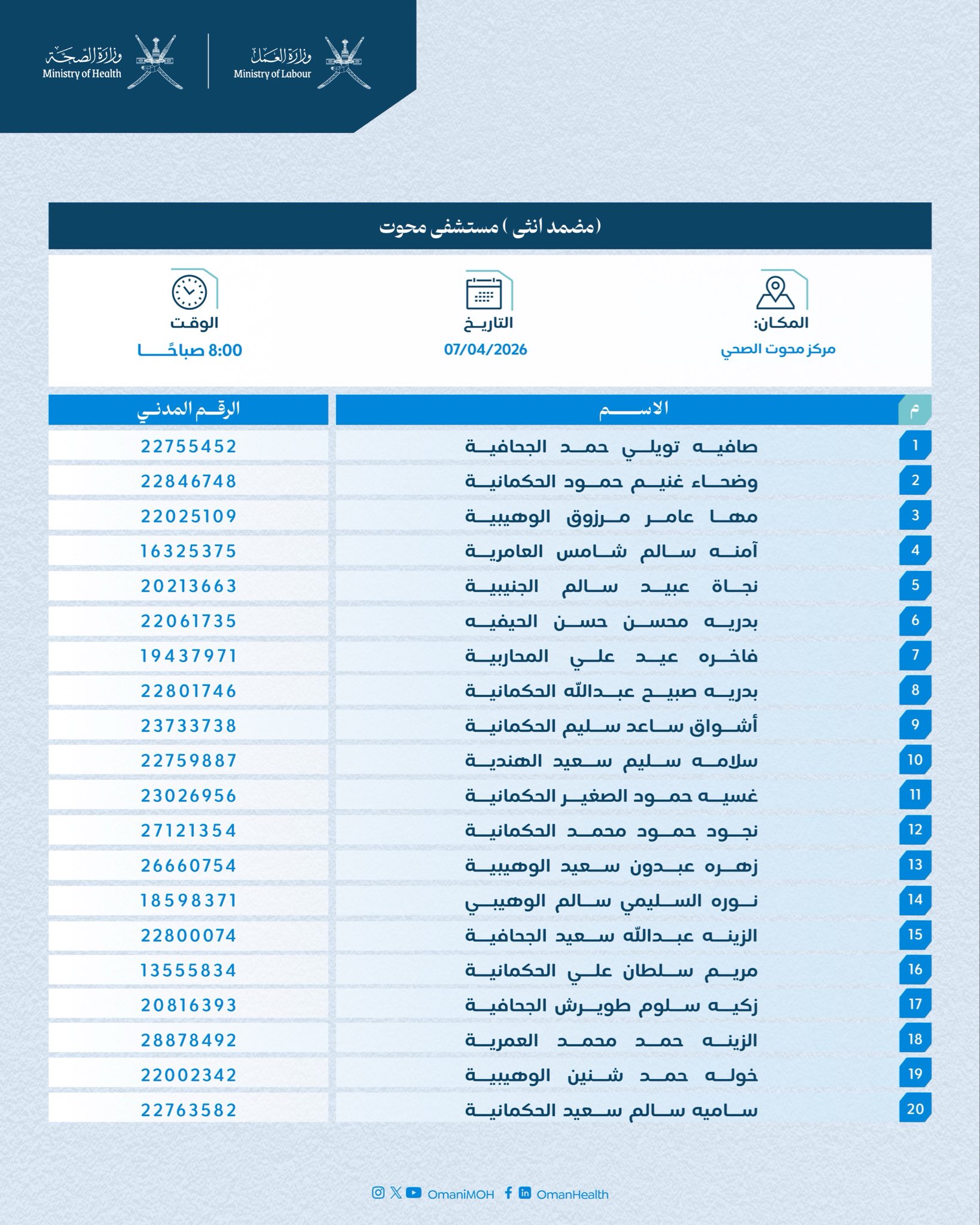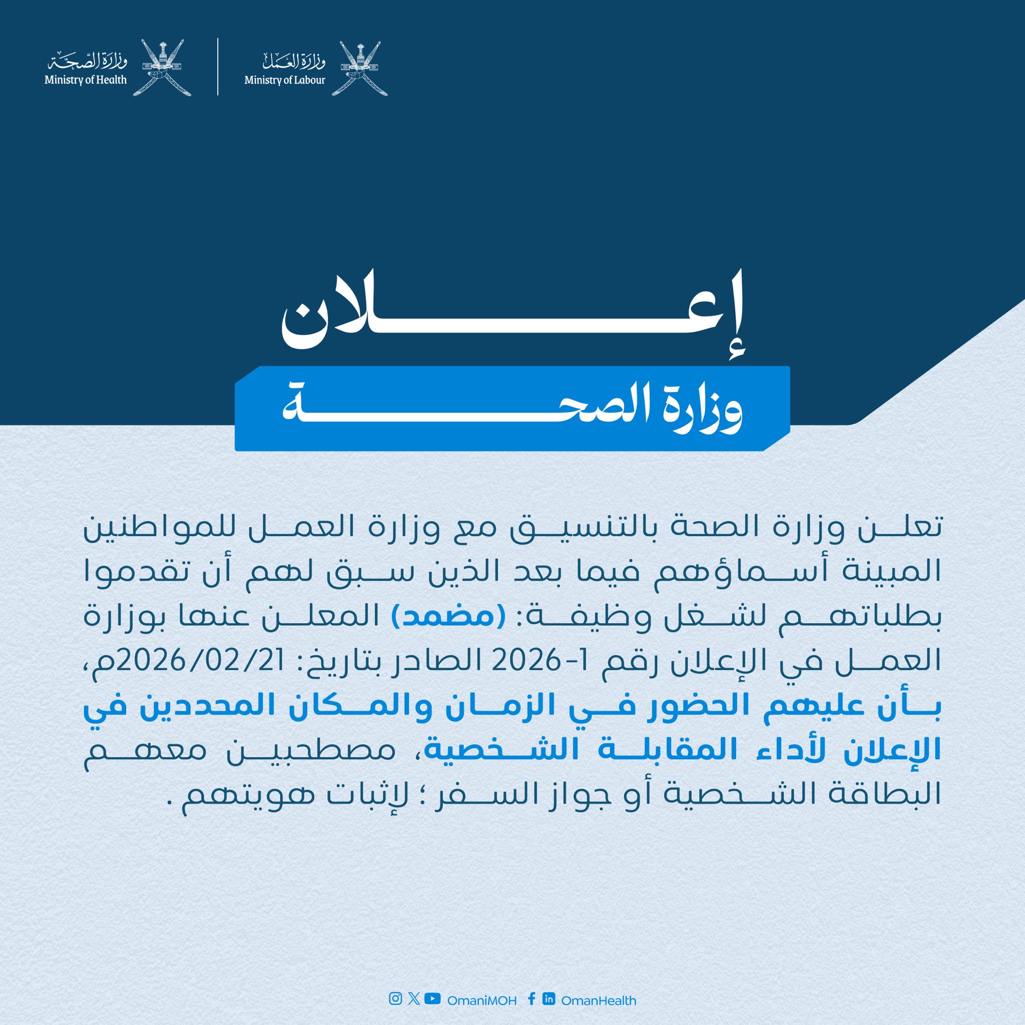 الموضوع: وزارة الصحة - أسماء المترشحين لأداء المقابلة الشخصية لشغل وظيفة (مضمد)