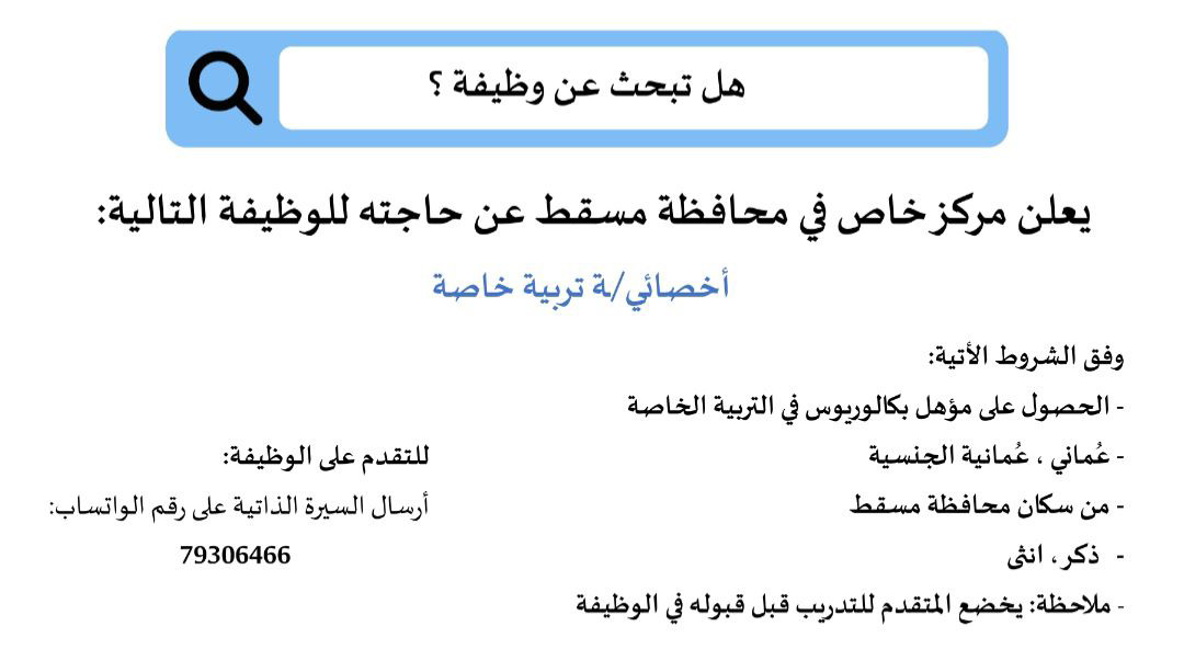 الموضوع: مركز خاص في مسقط - وظيفة شاغرة ( أخصائي/ة تربية خاصة )