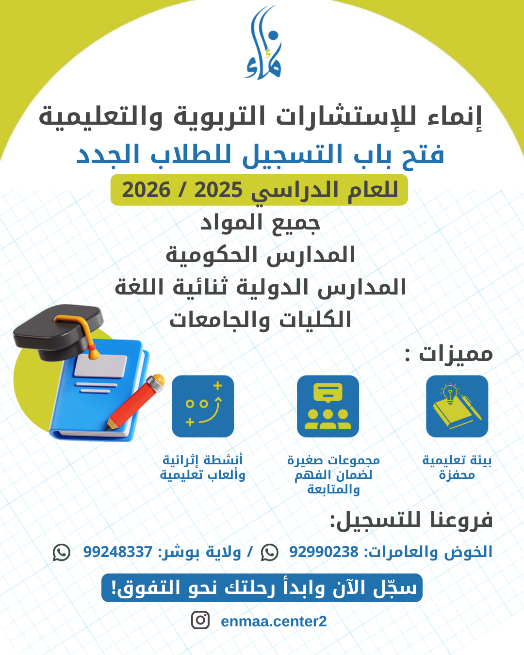 مركز إنماء للاستشارات التربوية والتعليمية يعلن عن بدء التسجيل للعام الدراسي 2025 / 2026