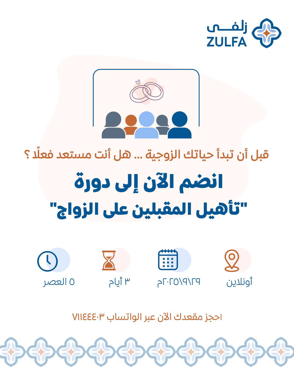✨ الزواج ليس مجرد حفل، بل هو رحلة تتطلب الإستعداد الواعي. في دورة "تأهيل المقبلين على الزواج"، ستتعلم